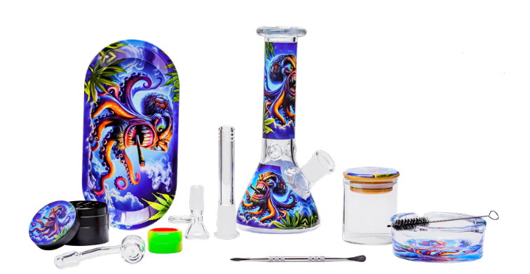 Upgrade your smoking game with the 8" OG Original Gift Set! This set includes a bong, ashtray, rolling tray, and more. Enjoy smooth hits with the banger and bowl, keep your stash organized in the silicone container, and easily clean with the included brush. Perfect for any smoking enthusiast.