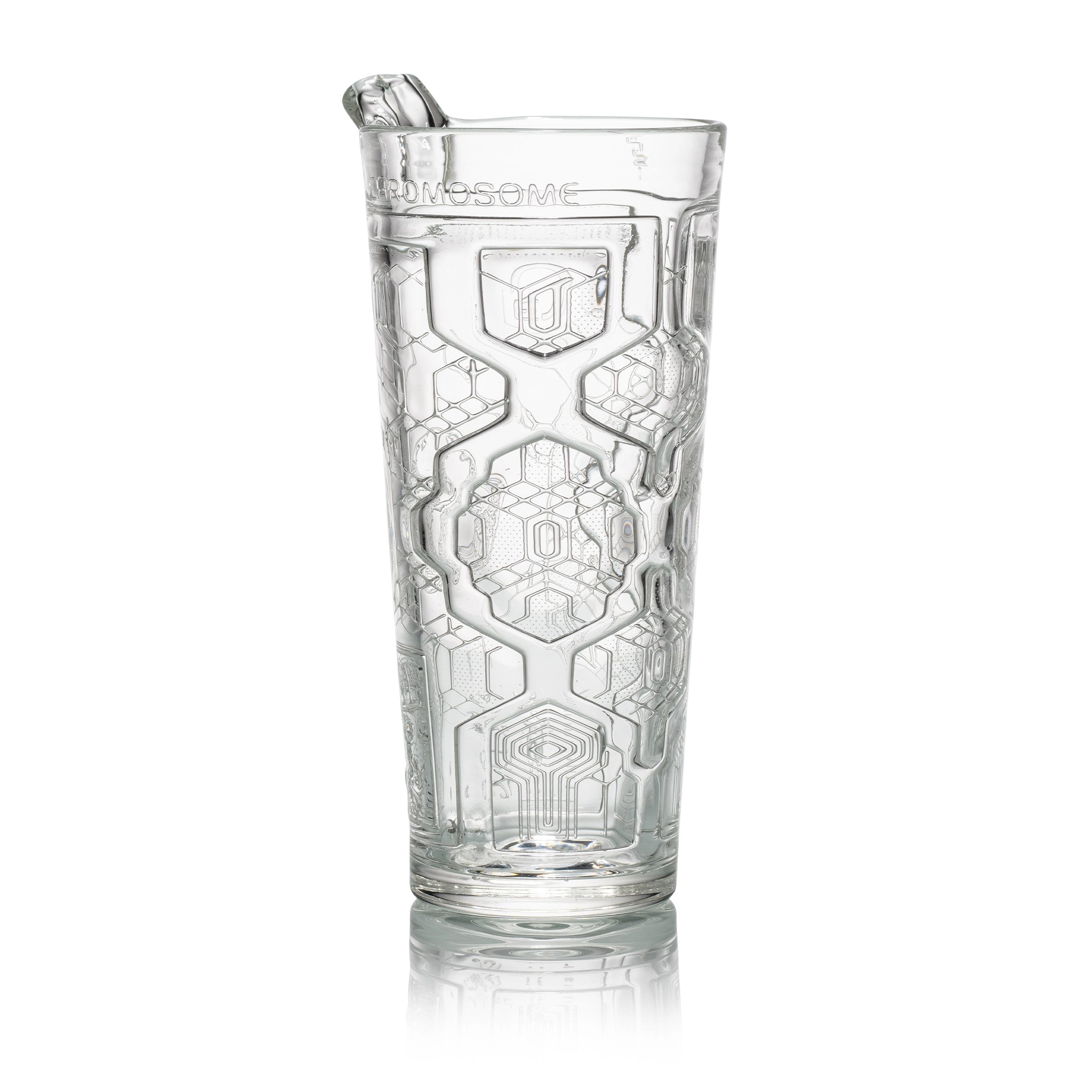 Crafted from premium borosilicate glass and standing at 7.5 inches tall, the Chromosome tumbler by O₃ blends high-tech design with cosmic fantasy. Featuring a Human Chromosome Aqueduct, this tumbler symbolizes the blueprint for human life, engineered by an advanced alien civilization. The intricate grid pattern reflects the alien technology used to shape our DNA, evoking wonder and curiosity about our origins.