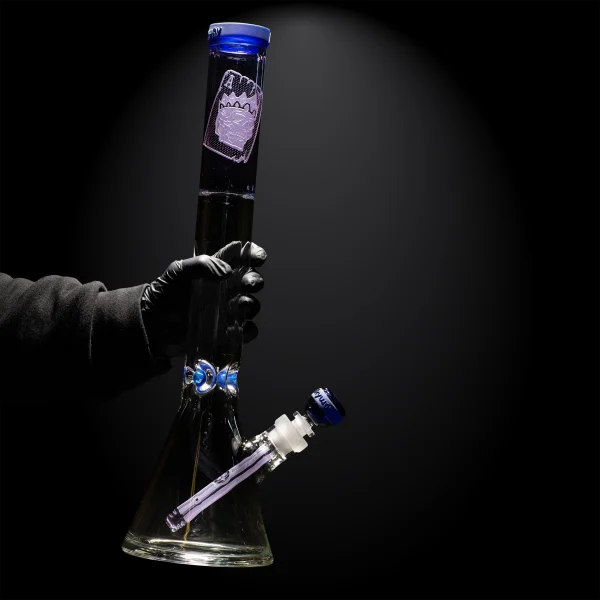 Part of the Skullduggery Collection, this 18″ beaker depicts the ‘Curse of the Saint’ card in intricate detail. This card first appeared in the original ‘Skull Emperor’ beaker back in 2020 and is the first card drawn by King Horan in his card game with Death.