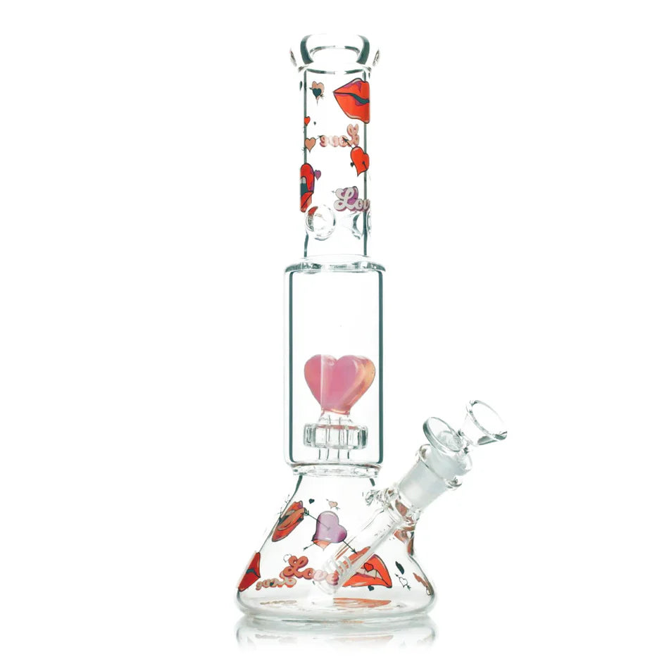 Lock lips and experience love at first toke with the Heart Dual Chamber Beaker Base Water Pipe from Red Eye Glass. Featuring a dual-chamber with a pink heart perc and built-in ice pinch. A decal design with lips, hearts, and the word "love" wraps around the neck and base of this water pipe. Made of 100% borosilicate glass to ensure you never suffer a broken heart. Take a chance on love with this Valentined themed bong!