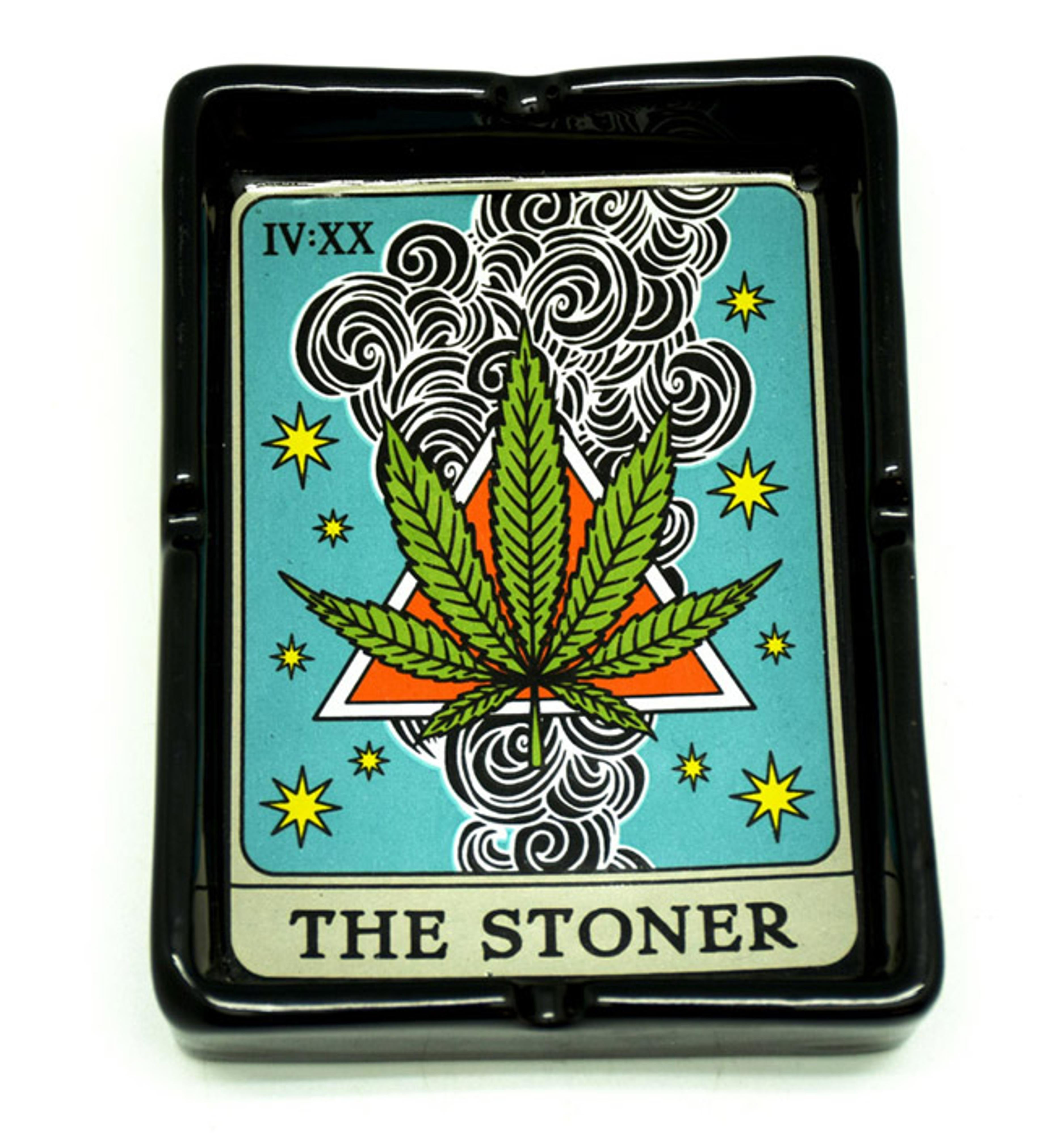 This Stoner ashtray is a fun piece to safely extinguish your smokable items. Great Tarot card style image of a pot leaf lays on the bottom of this black ceramic ashtray. 4" x 5 1/4" sizes colors may vary slightly.