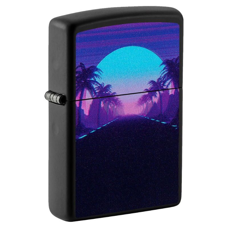 This Black Matte lighter is anything but plain. Place it under ultraviolet light to reveal a giant sunset scene applied with our specialty Blacklight process. Comes packaged in a gift box. For optimal performance, fill with Zippo lighter fuel.